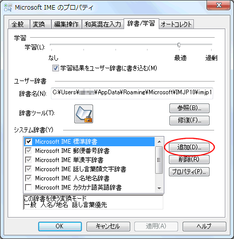 「辞書・学習」を開き、「システム辞書」の部分で「追加」をクリックします。