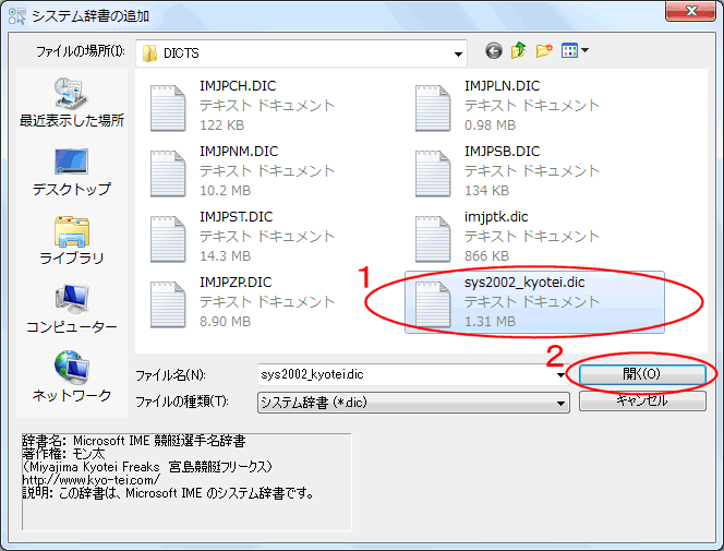 手順1で保存した「sys2002_kyotei.dic」を選択し、「開く」をクリックします。