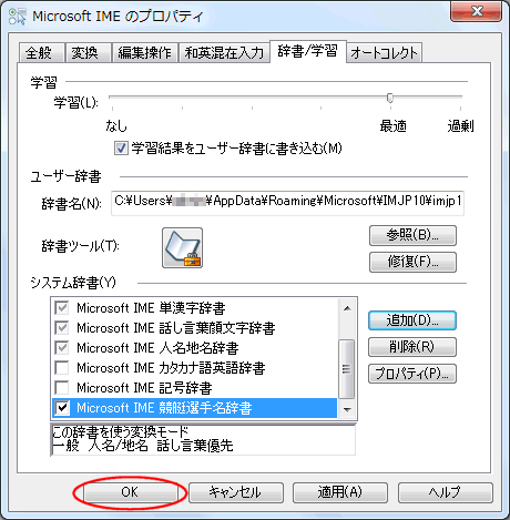 IME 競艇選手名辞書」をあらかじめ削除しておいて下さい。(削除した後に「適用(A)」を必ずクリックして下さい。)