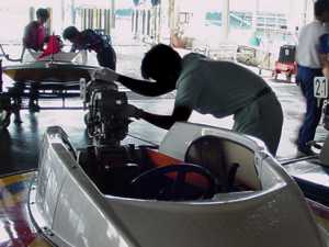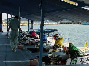 ピットでは選手・ボート・モーターの装着の確認、始動確認、トラブル時の対応などのため検査員が待機します。