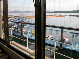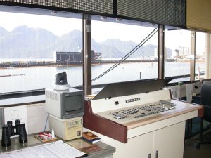 少し奥まっていますが、水面を見渡せるようになっています。 右の操作卓で各種の合図を行います。