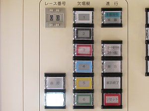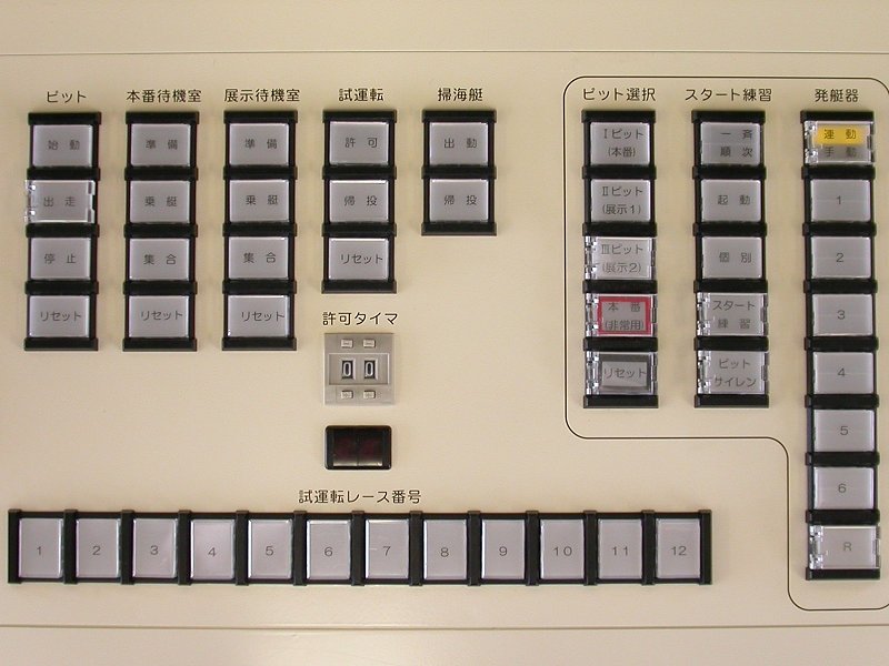 このボタン操作によって自動発艇機その他のものが連動するようになっています。 対岸の表示装置左側、オッズの上に表示されているのも、このボタン操作によるものです。 この「欠場艇」はスタート事故艇ではなく事前欠場のことです。