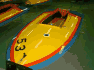 【2002年 新ボート】 2002年9月14日の開催より使用が開始される、YM-730型新ボートです。(新ボートとは、「新型ボート」という意味ではありません。) このようなデザインとなります。 ソフトバウには保護シートがかけられていますが、実際には白色です。 カウリングが装着されていないため、装着後とは印象が異なると思います。