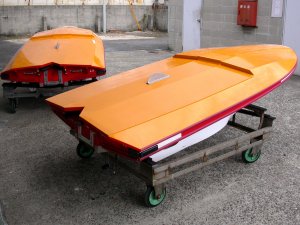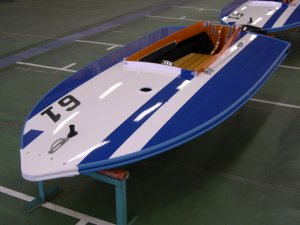 ヤマト発動機株式会社製 YM-730型C級ハイドロプレン 全長2895mm 全幅1316mm 重量69kg(カウリング除く) その他に江戸川専用のYM-740(D級)があります。 性能差をなくすため、モーターともども1年間で廃棄されますが、一部は広島支部選手の練習用としてさらに1年間使用します。 ボートの全体写真はこちら カットモデルはこちら |