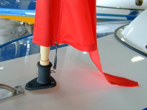 木製の棒に差し込み、旗に付いたゴムをフックに掛けます。 |