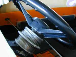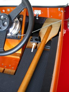 ボートの前部右側(ハンドルより奥)に矢印のゴム製のストッパーで固定されています。 |