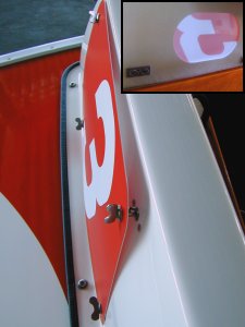 艇番と同じようなプレート(ネーム板)を使用しているレース場も多いですが、宮島ではシールを左右のカウリングに直接貼っています。 |