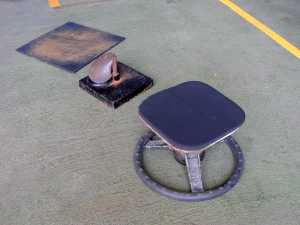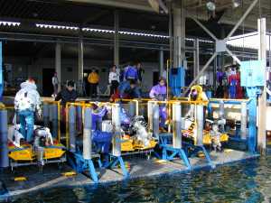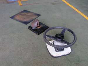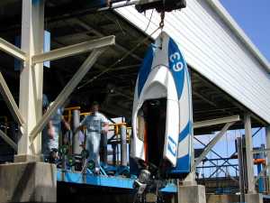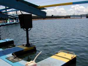 水面から装着場までは高低差があるためこのようなリフトを使います。 |
