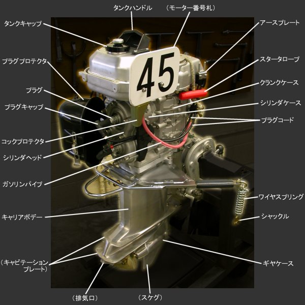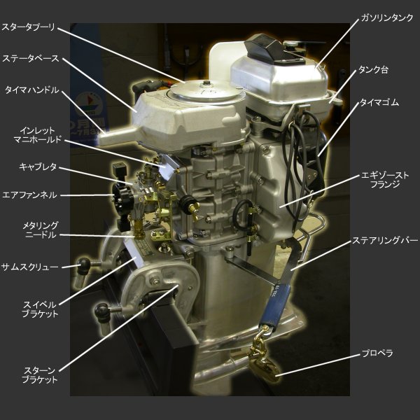 | 種類:水冷2サイクルガソリン機関 形式:縦型直列2気筒 吸気方式:リードバルブ 始動方式:ロープスタート 点火方式:フライホイル・トランジスタマグネト 気化器型式:ミクニBV-36 燃料容量:2.3L ギヤ比:14:15 燃料:ガソリン/オイル混合 内径×行程:66mm×58mm 総排気量:396.9cc 圧縮比:8.6 最大出力:23.5kW(32ps)/6600rpm 最大トルク:36.3N・m(3.7kgfm)/5500rpm 最大回転数:6800rpm 全長:575mm 全幅:315mm 全高:979mm 重量:41.5kg |