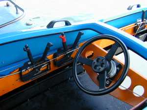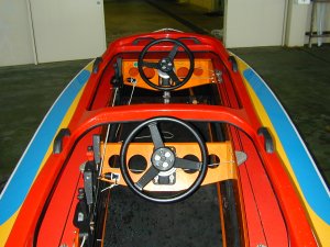 後部座席です。前後それぞれにハンドルとスロットルレバーがついています。 |
