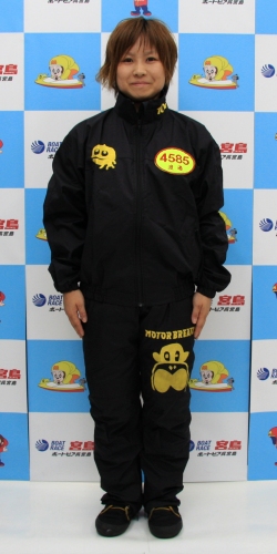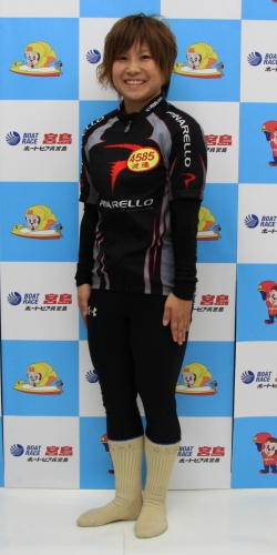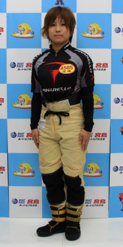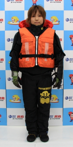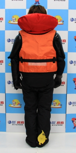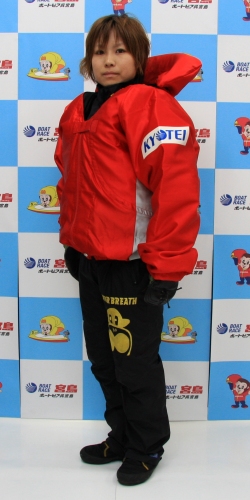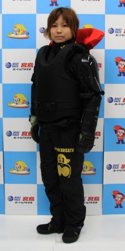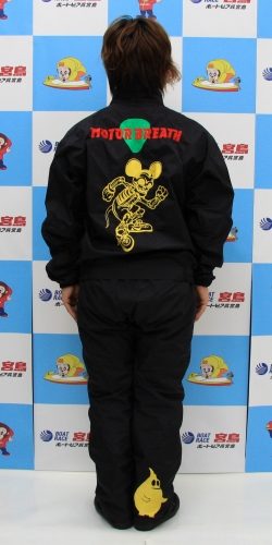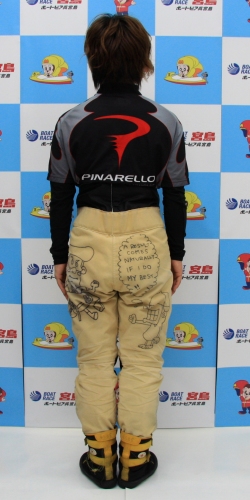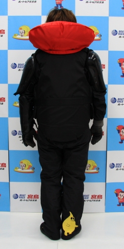最後に勝負服を着て準備完了! もちろん、ヘルメットもかぶります。 この勝負服は薄手の生地のように見えますが、艇番色の生地の下にはケブラーズボンと同じ黄色い生地が入っていますので、かなり固いです。 デザインは何種類もありますが、色が分かりやすいことから宮島ではこのデザインを長らく採用しています。 |